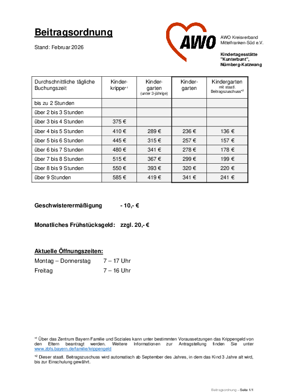 Bring-Zeiten: 07:00 Uhr bis 09:00 Uhr Abhol- Zeiten: 12:00 Uhr bis 12:30 Uhr sowie 14:00 Uhr bis 17:00 Uhr - freitags bis 16:00 Uhr |