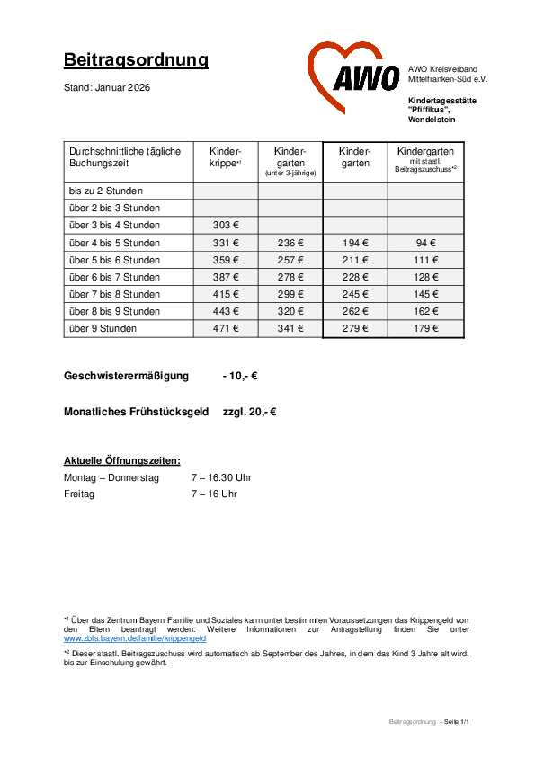 Die Kindertagesstätte "Pfiffikus" bietet Ihnen folgende Öffnungszeiten: