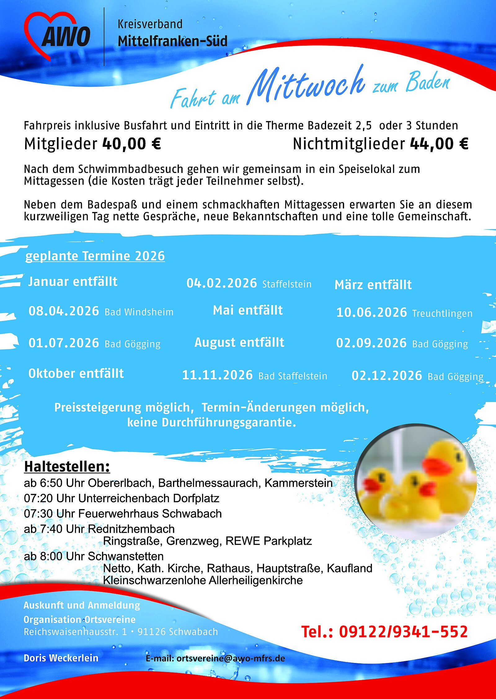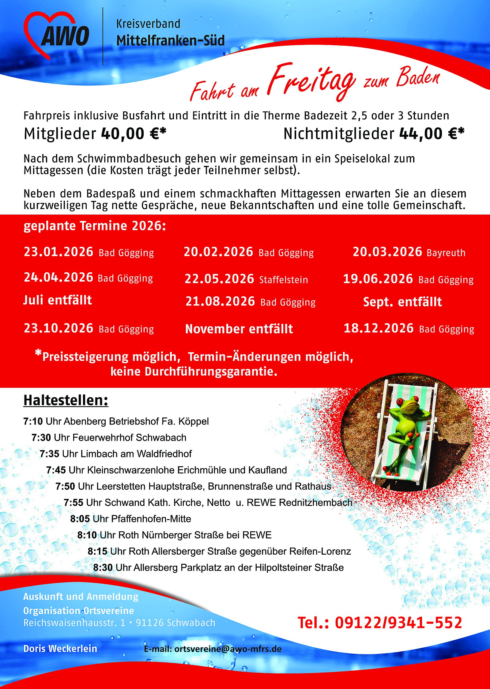 Badefahrt in die Limes-Therme nach Bad Gögging oder in andere wechselnde Thermen zu begleiten. Wir holen Sie am Morgen an verschiedenen Bushaltestellen im Landkreis Roth sowie der Stadt Schwabach ab.