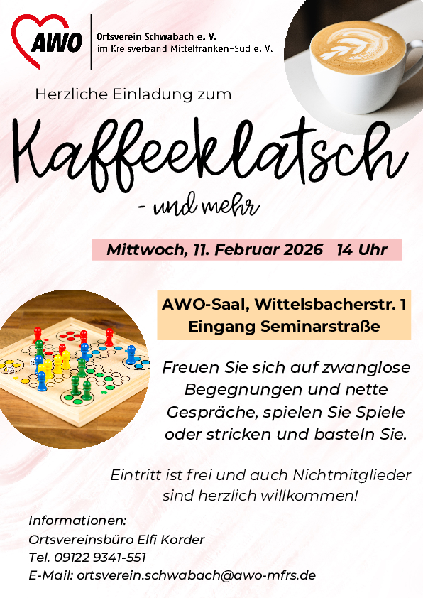 Am Mittwoch einmal oder zweimal im Monat treffen sich viele Interessierte zum Kaffeeklatsch um mit anderen zu spielen, basteln oder einfach zum Ratschen im AWO-Saal, Haupteingang Seminarstraße in Schwabach.