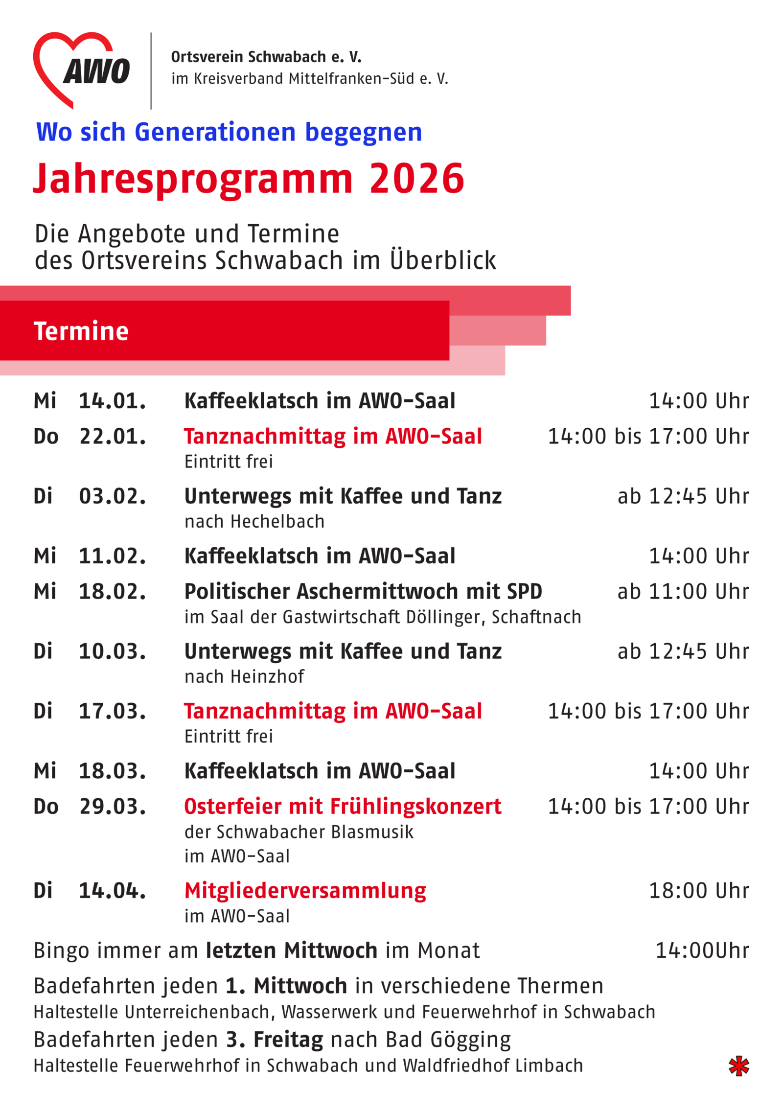 Einmal im Monat am Dienstag organisiert der AWO Ortsverein Schwabach eine Halbtagesfahrt unter dem Motto „Unterwegs mit Kaffee und Tanz“. Dabei werden im wechselnden Turnus verschiedene Orte und Gaststätten mit dem Bus angefahren. Neben Live-Musik wird die Möglichkeit zum gemeinsamen Kaffeetrinken und Abendessen geboten (die Kosten hierfür trägt jeder Teilnehmer selbst).
